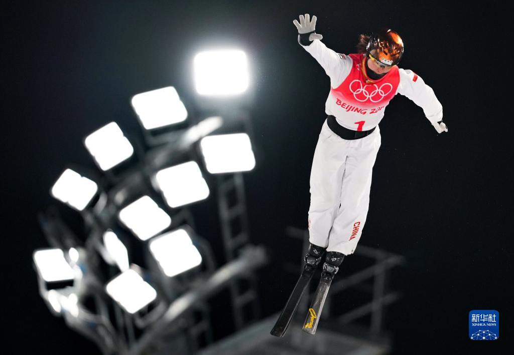 徐夢桃在張家口云頂滑雪公園舉行的北京2022年冬奧會自由式滑雪女子空中技巧決賽中(2022年2月14日攝)。新華社記者 牟宇 攝