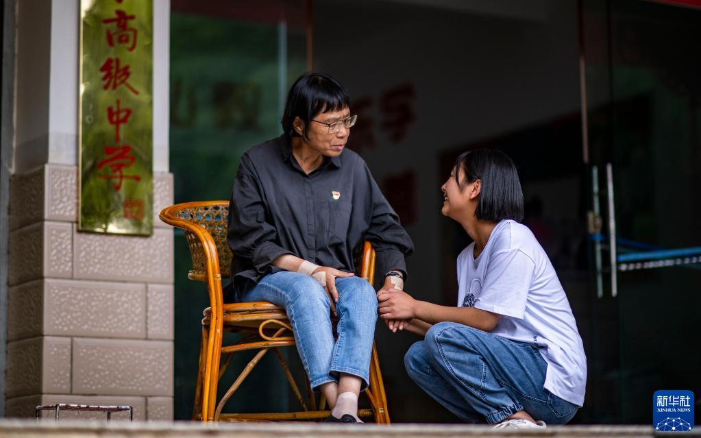 云南麗江華坪女子高級(jí)中學(xué)黨支部書(shū)記、校長(zhǎng)張桂梅在校園內(nèi)與學(xué)生交談(2021年8月23日攝)。新華社記者 江文耀 攝