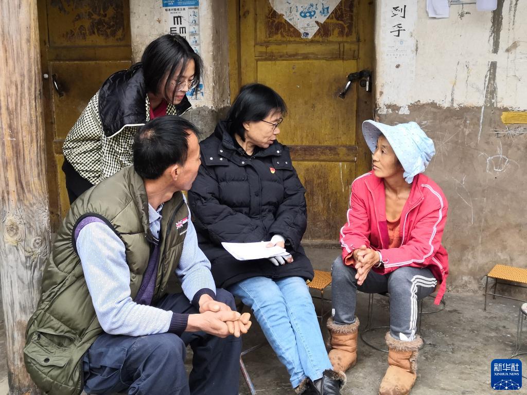云南麗江華坪女子高級(jí)中學(xué)黨支部書(shū)記、校長(zhǎng)張桂梅(右二)在家訪時(shí)與學(xué)生家長(zhǎng)交談(2021年2月9日攝)。新華社發(fā)(王秀麗 攝)