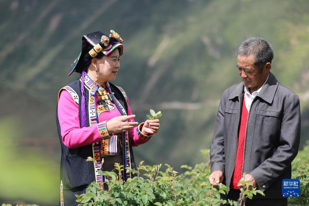 9月25日,陳望慧在四川阿壩州小金縣新橋鄉(xiāng)共和村與村民喻福良探討種植經(jīng)驗。新華社記者 劉瓊 攝
