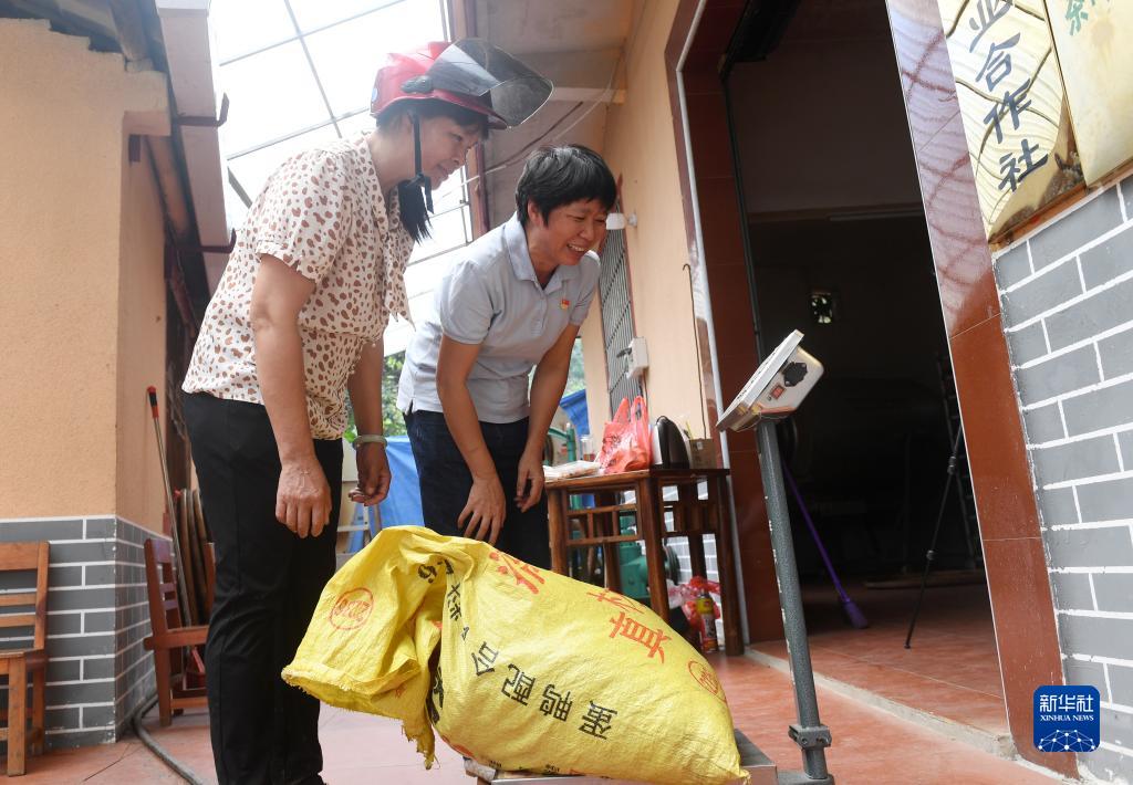 在廣西蒼梧縣六堡鎮(zhèn)山坪村,祝雪蘭(右)和村民一起稱剛采回來的茶葉重量(2022年9月22日攝)。新華社記者 陸波岸 攝