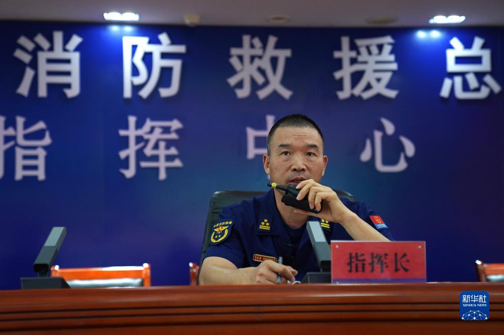江西省消防救援總隊指揮中心專業(yè)技術(shù)一級指揮長李勝利在江西消防救援總隊指揮中心進行遠程調(diào)度(2022年9月14日攝)。新華社記者 萬象 攝