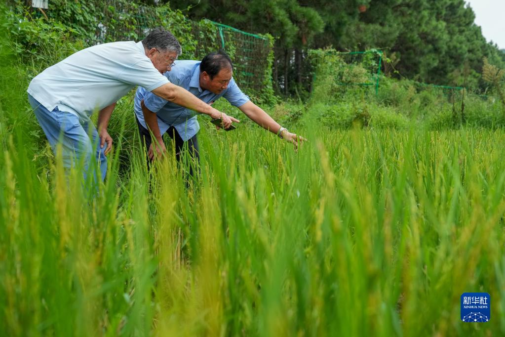 趙亞夫(左)在江蘇省句容市天王鎮(zhèn)戴莊村查看水稻長勢(2022年9月9日攝)。新華社記者 李博 攝