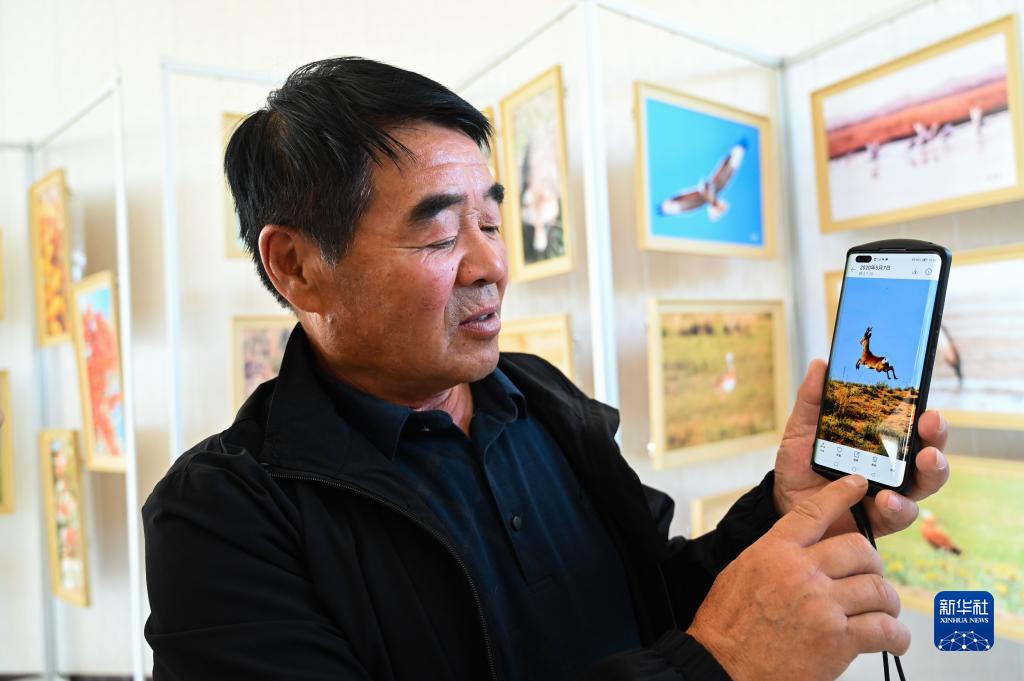 廷·巴特爾展示在自家草場拍攝的野生動(dòng)物(9月8日攝)。新華社記者 劉磊 攝