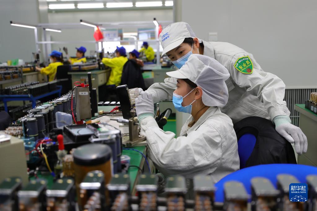 柯曉賓在沈陽鐵路信號(hào)有限責(zé)任公司電器中心車間指導(dǎo)班組成員調(diào)試?yán)^電器(2022年9月7日攝)。新華社記者 楊青 攝