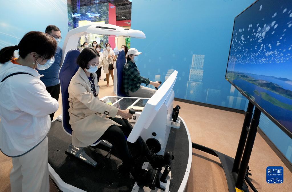 10月7日,觀眾在“奮進(jìn)新時(shí)代”主題成就展上體驗(yàn)操縱直升機(jī)訓(xùn)練模擬器。