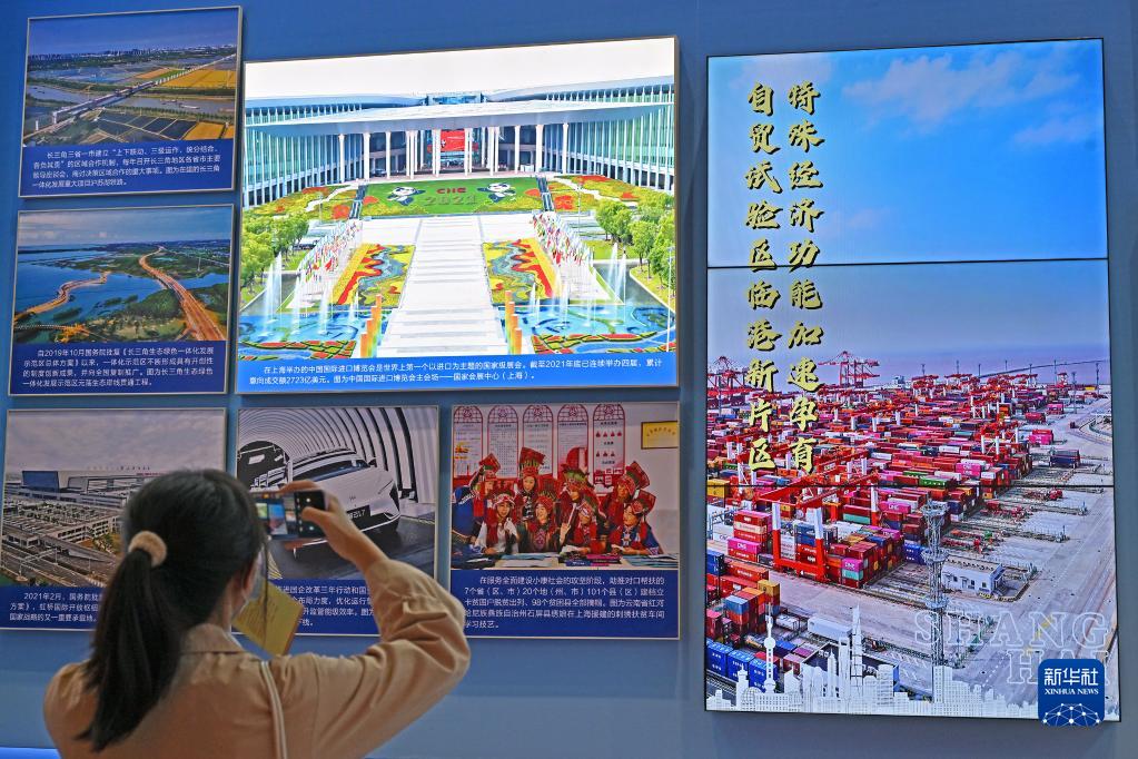 10月8日,一名觀眾在上海展區(qū)拍攝進(jìn)博會(huì)主會(huì)場的宣傳圖。新華社記者 李鑫 攝