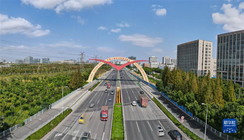 這是中國(上海)自由貿(mào)易試驗(yàn)區(qū)保稅片區(qū)的標(biāo)志性景觀“海鷗門”(10月17日攝,無人機(jī)照片)。新華社記者 方喆 攝