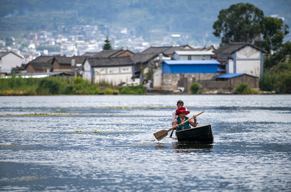 9月28日,洱源西湖當(dāng)?shù)卮迕駝澊鲂?。新華社記者 陳欣波 攝