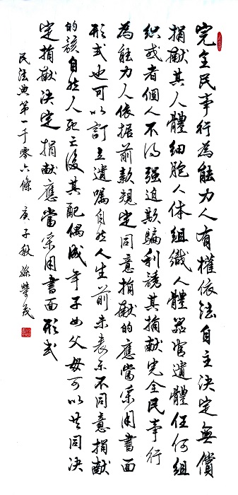 民法典第一千零六條 完全民事行為能力人有權(quán)依法自主決定無償捐獻(xiàn)其人體細(xì)胞、人體組織、人體器官、遺體。任何組織或者個人不得強(qiáng)迫、欺騙、利誘其捐獻(xiàn)。完全民事行為能力人依據(jù)前款規(guī)定同意捐獻(xiàn)的,應(yīng)當(dāng)采用書面形式,也可以訂立遺囑。自然人生前未表示不同意捐獻(xiàn)的,該自然人死亡后,其配偶、成年子女、父母可以共同決定捐獻(xiàn),決定捐獻(xiàn)應(yīng)當(dāng)采用書面形式。