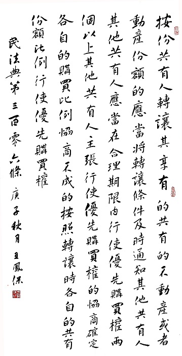民法典第三百零六條 按份共有人轉(zhuǎn)讓其享有的共有的不動(dòng)產(chǎn)或者動(dòng)產(chǎn)份額的,應(yīng)當(dāng)將轉(zhuǎn)讓條件及時(shí)通知其他共有人。其他共有人應(yīng)當(dāng)在合理期限內(nèi)行使優(yōu)先購(gòu)買(mǎi)權(quán)。