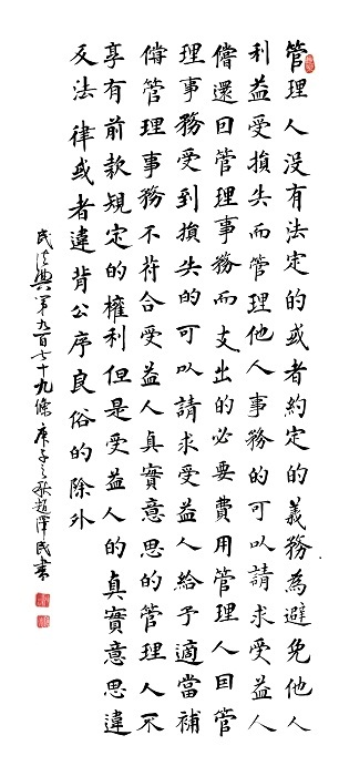 民法典第九百七十九條 管理人沒有法定的或者約定的義務(wù),為避免他人利益受損失而管理他人事務(wù)的,可以請(qǐng)求受益人償還因管理事務(wù)而支出的必要費(fèi)用;管理人因管理事務(wù)受到損失的,可以請(qǐng)求受益人給予適當(dāng)補(bǔ)償。