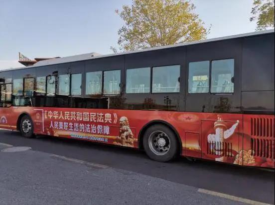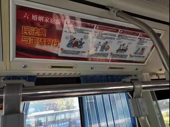 在宣傳《民法典》公交車車體內(nèi)外,精心營造學(xué)習(xí)宣傳《民法典》的濃厚氛圍,將《民法典》公交專線主題設(shè)計(jì)為“《民法典》與生活同行”,車體以紅色為主基調(diào),圖文并茂,視覺沖擊力強(qiáng)。車內(nèi)兩側(cè)、坐椅靠背、車廂展板等位置進(jìn)行了全方位包裝,車內(nèi)移動(dòng)電視持續(xù)播放《民法典》宣傳短視頻,展示《民法典》中見義勇為免責(zé)、小區(qū)共有場地收入歸業(yè)主、夫妻共同債務(wù)如何界定等與百姓生活息息相關(guān)的法條。乘客在乘車的同時(shí),可以感受到學(xué)習(xí)《民法典》的樂趣和必要性。