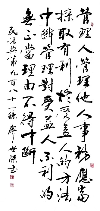 民法典第九百八十一條 管理人管理他人事務,應當采取有利于受益人的方法。中斷管理對受益人不利的,無正當理由不得中斷。