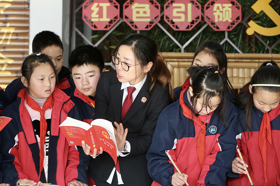 村巷法官徐銀銀走進(jìn)浙江省德清縣莫干山中心學(xué)校,書寫民法典,放飛法治夢。