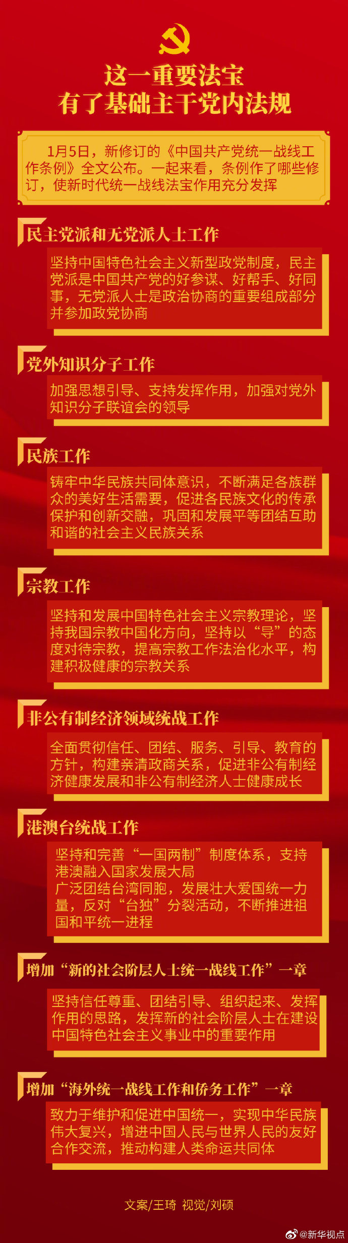 統(tǒng)一戰(zhàn)線是黨的事業(yè)取得勝利的重要法寶。1月5日,新修訂的《中國(guó)共產(chǎn)黨統(tǒng)一戰(zhàn)線工作條例》全文公布。條例作了哪些修訂,使新時(shí)代統(tǒng)一戰(zhàn)線法寶作用充分發(fā)揮,為全面建設(shè)社會(huì)主義現(xiàn)代化國(guó)家、實(shí)現(xiàn)中華民族偉大復(fù)興的中國(guó)夢(mèng)凝心聚力,一起來(lái)看↓