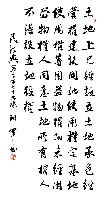 民法典第三百七十九條 土地上已經(jīng)設立土地承包經(jīng)營權、建設用地使用權、宅基地使用權等用益物權的,未經(jīng)用益物權人同意,土地所有權人不得設立地役權。