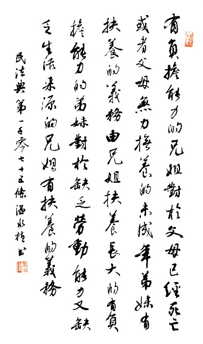 民法典第一千零七十五條 有負擔能力的兄、姐,對于父母已經(jīng)死亡或者父母無力撫養(yǎng)的未成年弟、妹,有扶養(yǎng)的義務。