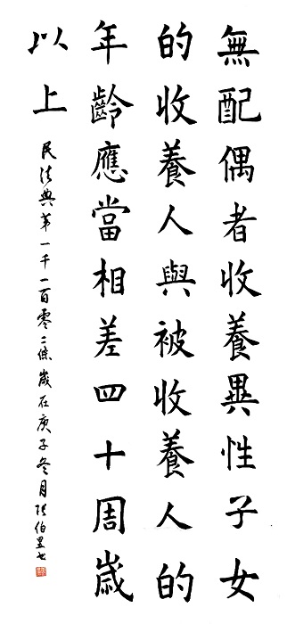 民法典第一千一百零二條 無配偶者收養(yǎng)異性子女的,收養(yǎng)人與被收養(yǎng)人的年齡應(yīng)當(dāng)相差四十周歲以上。