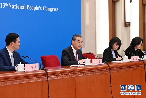 3月7日,十三屆全國人大四次會議在北京人民大會堂新聞發(fā)布廳舉行記者會,邀請國務委員兼外交部長王毅就“中國外交政策和對外關系”相關問題回答中外記者提問。為有效防控疫情,共同維護公共衛(wèi)生與健康,記者會采用網絡視頻形式進行。 新華社記者 陳曄華 攝