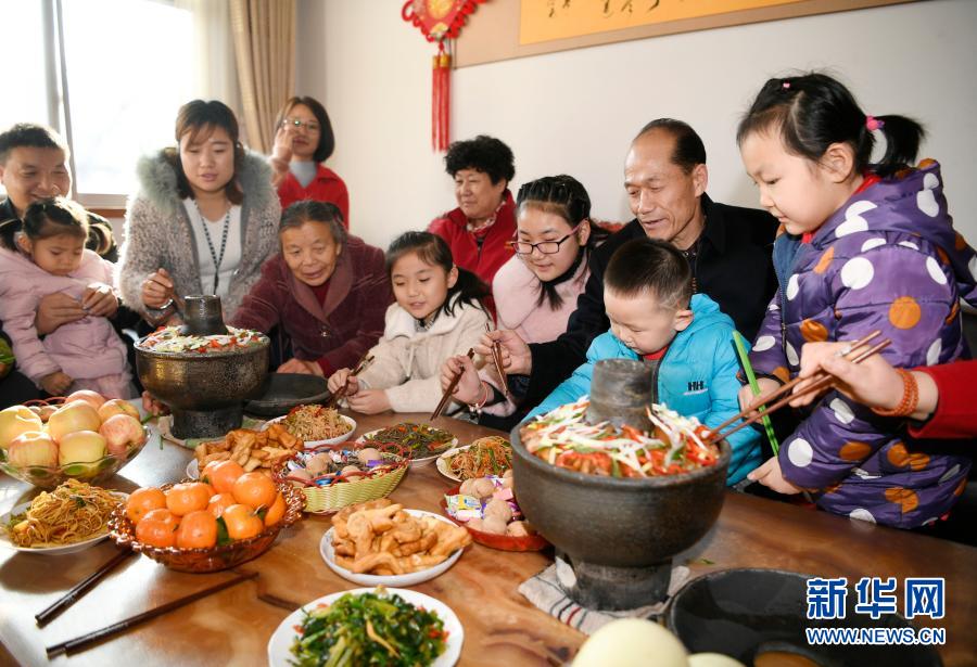 大年三十,在寧夏銀川市永寧縣閩寧鎮(zhèn)福寧村,謝興昌(右二)和家人一起吃團(tuán)圓飯(2020年1月24日攝)。新華社記者 王鵬 攝