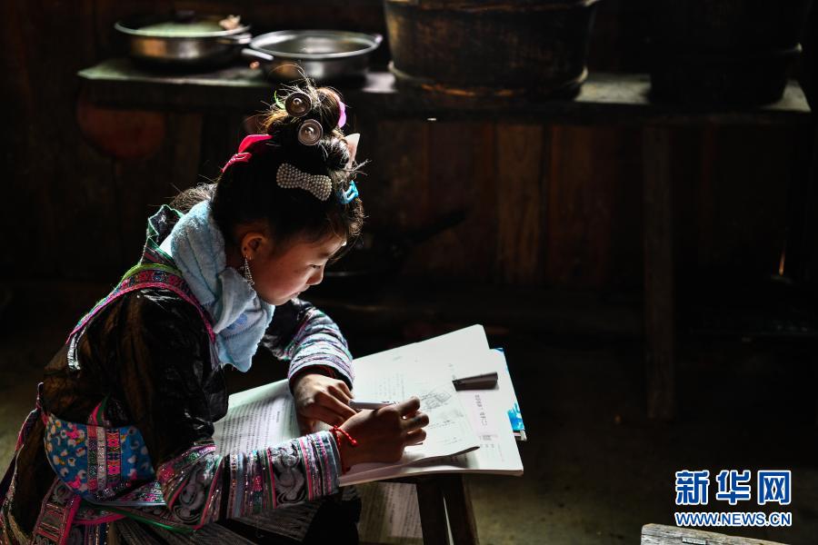 2月25日,貴州省從江縣丙妹鎮(zhèn)大歹小學的學生潘污簡在家里做寒假作業(yè)。新華社記者 楊文斌 攝