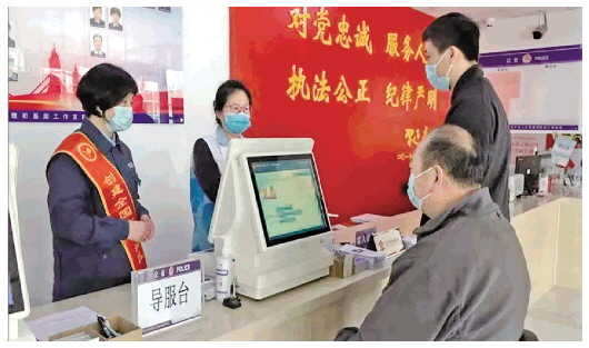圖為通州公安分局出入境智慧辦理廳內(nèi),引導(dǎo)員引導(dǎo)群眾辦理業(yè)務(wù)。
