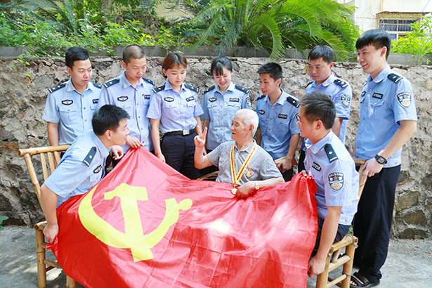 近日,江西省贛州市于都縣公安局組織部分青年黨員民警和入黨積極分子來到貢江鎮(zhèn)長龍社區(qū),看望抗戰(zhàn)老兵萬更志,聆聽老黨員講述抗日戰(zhàn)爭的經(jīng)歷和黨的發(fā)展歷史。