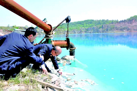 圖為蕪湖市弋江區(qū)檢察院檢察官現場勘測污染水體。通訊員 朱玉勝 攝