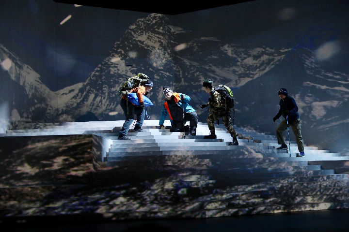 舞臺上,話劇《種子天堂》劇情進(jìn)入最高潮——在缺氧、強(qiáng)風(fēng)惡劣環(huán)境下,鐘揚拼盡氣力來到海拔6000米的高度。當(dāng)他終于在一堆雜草和冰雪中發(fā)現(xiàn)那株頑強(qiáng)的雪蓮時,就像父親看到自己剛出生的嬰兒,臉上掛著深深的喜悅,凝望良久……