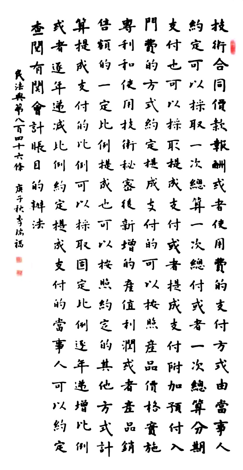 民法典第八百四十六條 技術(shù)合同價款、報酬或者使用費的支付方式由當(dāng)事人約定,可以采取一次總算、一次總付或者一次總算、分期支付,也可以采取提成支付或者提成支付附加預(yù)付入門費的方式。