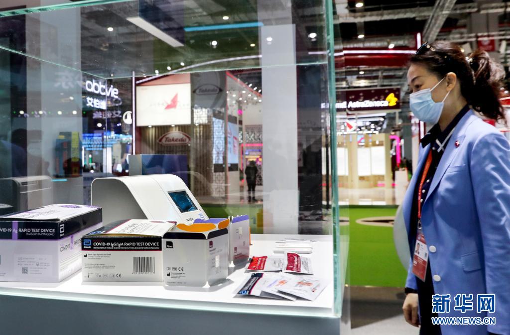 在第三屆中國國際進口博覽會公共衛(wèi)生防疫專區(qū),參觀者觀看雅培展示的便于攜帶且適用于大規(guī)模檢測的新冠病毒快速抗原檢測試劑和產(chǎn)品(2020年11月5日攝)。新華社記者 劉穎 攝