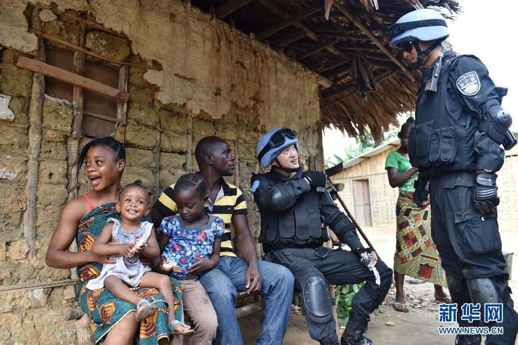 中國維和警察防暴隊隊員在利比里亞格林維爾的一座村莊詢問當?shù)刂伟驳惹闆r(2015年11月3日攝)。新華社記者 孫瑞博 攝