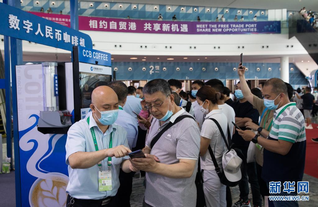 在海口舉行的首屆中國國際消費品博覽會上,參觀者體驗數(shù)字人民幣咖啡機(2021年5月10日攝)。新華社記者 金立旺 攝
