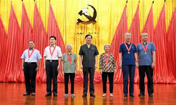 會(huì)場內(nèi),紅旗漫卷,紅色紀(jì)念章閃耀奪目的光芒。頒授儀式在莊嚴(yán)的國歌聲中正式開始。當(dāng)榮獲“光榮在黨50年”紀(jì)念章的老黨員代表們步入會(huì)場時(shí),會(huì)場響起熱烈的掌聲。
