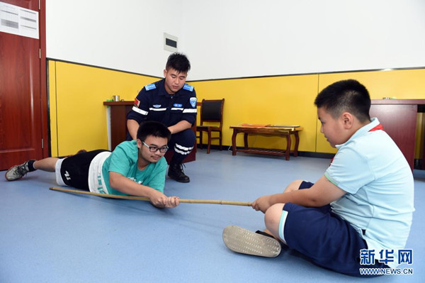 7月15日,在合肥市常青街道姚公社區(qū),合肥市水上應(yīng)急救援隊(duì)的隊(duì)員用現(xiàn)場(chǎng)演練的形式為孩子們介紹溺水后自救互救知識(shí)?!?/span>