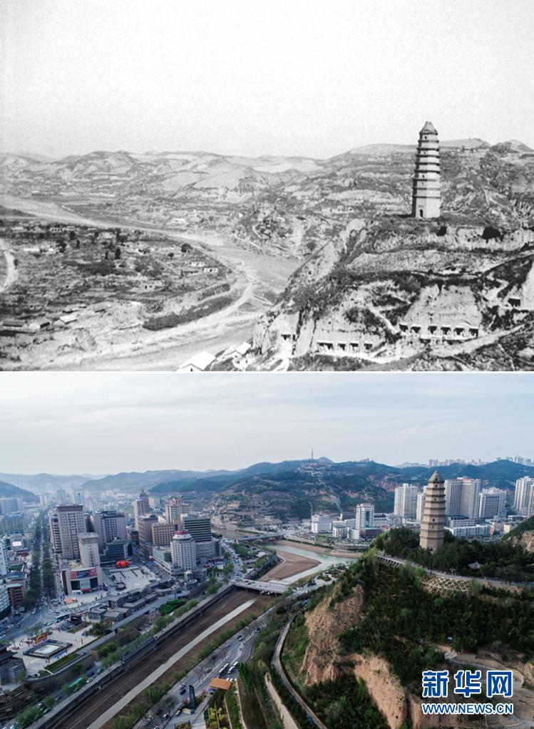 拼版照片:上圖是1938年拍攝的延安(資料照片),下圖是2021年4月22日拍攝的延安市(無人機照片,新華社記者張博文攝)。新華社發(fā)