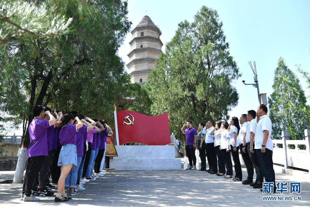 黨員干部在延安市寶塔山重溫入黨誓詞(2020年6月29日攝)。新華社記者 張博文 攝