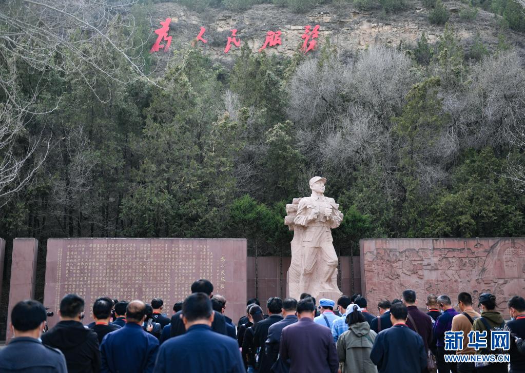 黨員干部在延安市張思德廣場進行現(xiàn)場教學(xué)活動(3月29日攝)。新華社記者 張博文 攝