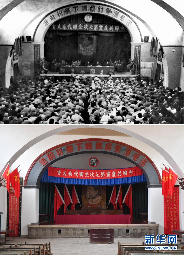 拼版照片:上圖是中共七大會場(資料照片),下圖是2021年3月31日拍攝的位于延安市楊家?guī)X革命舊址的中共七大會場(新華社記者 張博文 攝)。新華社發(fā)