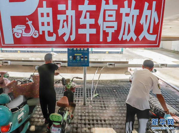 8月1日,在河北省遵化市一住宅小區(qū),業(yè)主將電動車停放在集中停放處。