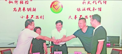 發(fā)揚(yáng)新時(shí)代“楓橋經(jīng)驗(yàn)”,運(yùn)用法治思維和法治方式化解矛盾糾紛。圖為在浙江省諸暨市楓橋鎮(zhèn)調(diào)解志愿者聯(lián)合會(huì)的調(diào)解下,當(dāng)事人握手言和。