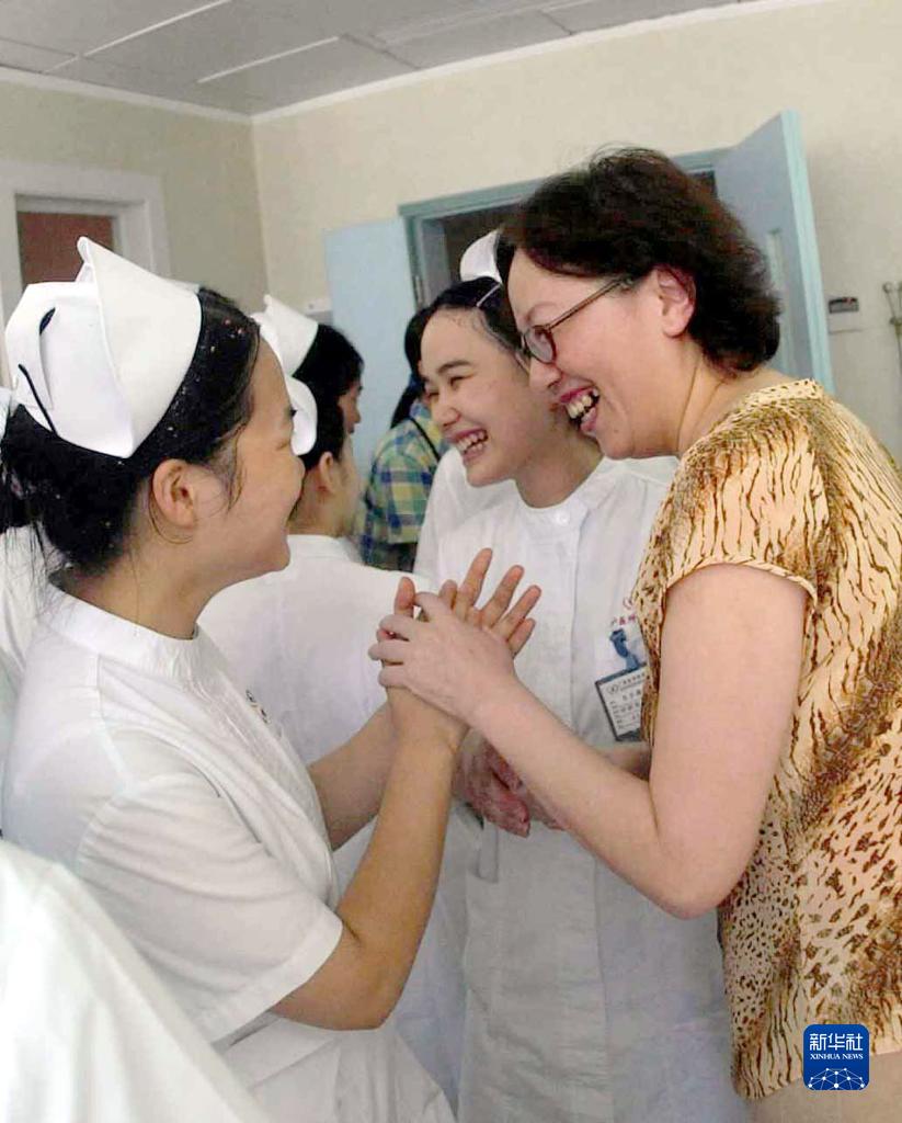 2003年7月2日,廣州醫(yī)學院第一附屬醫(yī)院最后出院的3名“非典”患者之一(右一)向白衣天使們表示感謝。新華社記者 陳學思 攝