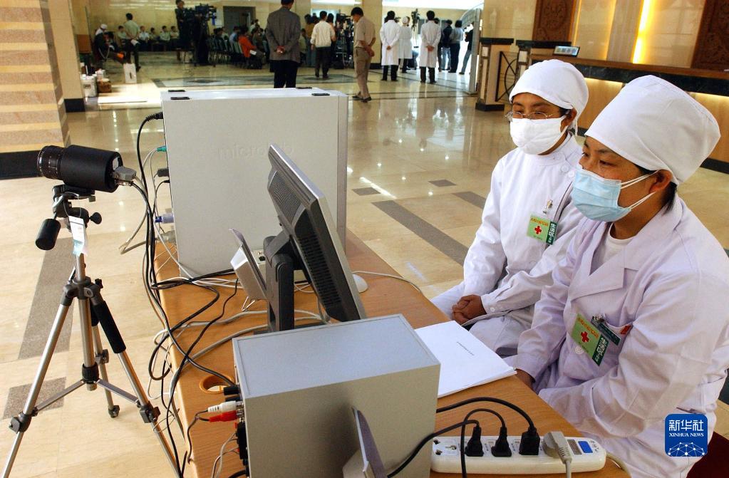 2003年5月7日,北京小湯山“非典”定點醫(yī)院的兩名工作人員在醫(yī)院進出口通過紅外熱成像系統(tǒng)對進出人員進行體溫監(jiān)測。新華社記者 王呈選 攝