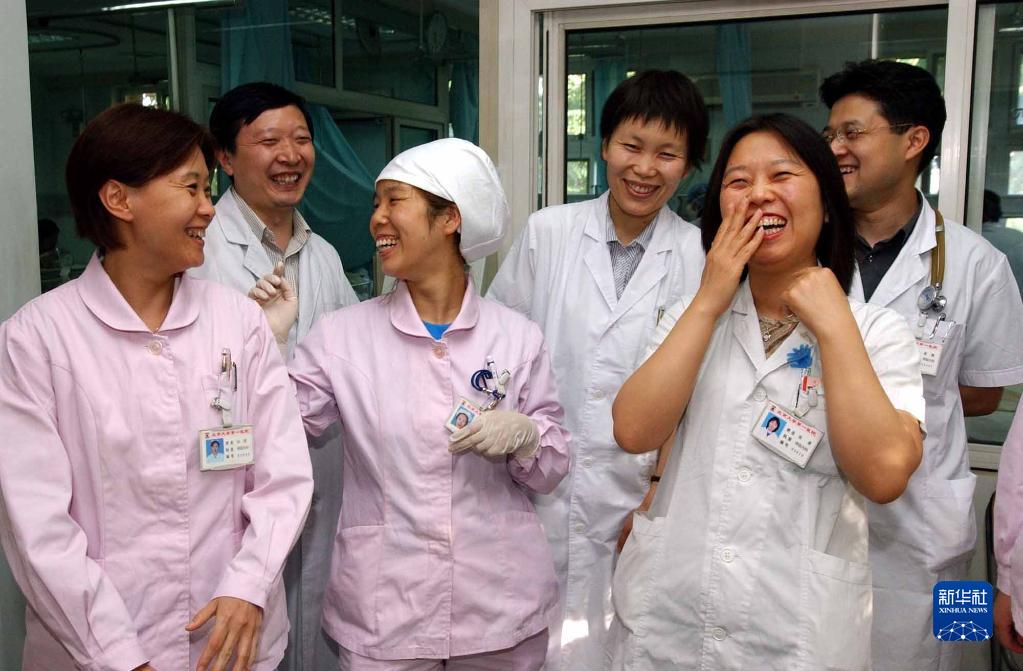 2003年6月24日,北京大學第一醫(yī)院呼吸科重癥監(jiān)護病房的醫(yī)護人員聽到世衛(wèi)組織對北京“雙解除”的消息后,露出勝利的笑容。當日,世界衛(wèi)生組織取消對北京地區(qū)的旅行警告,同時將北京從有疫情傳播地區(qū)的名單上去除。新華社記者 王呈選 攝