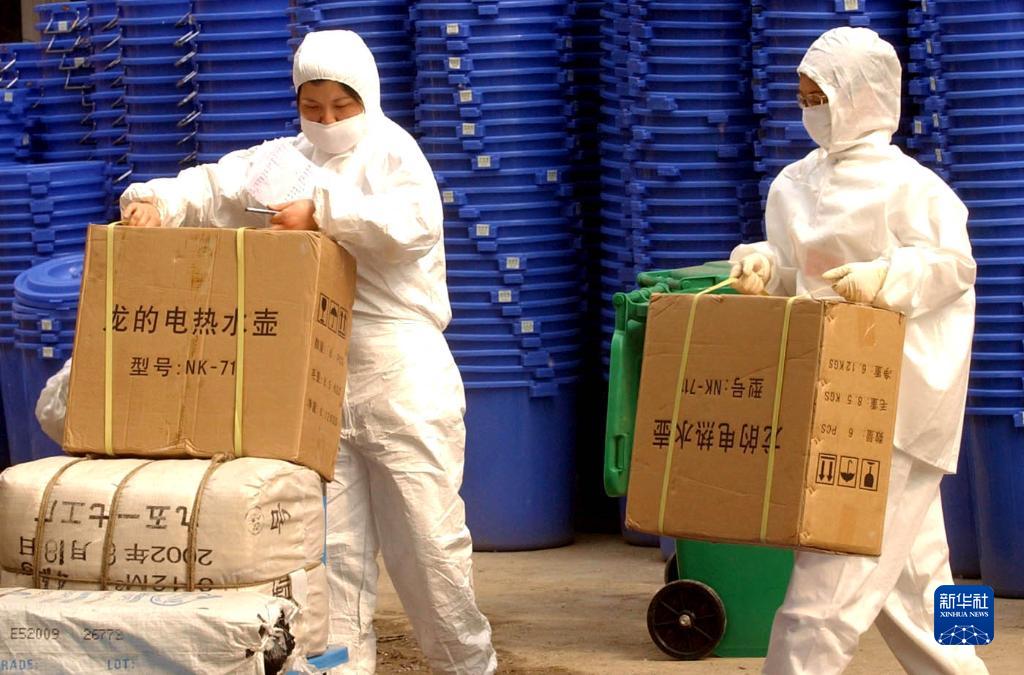 2003年5月7日,北京小湯山“非典”定點醫(yī)院的兩名后勤保障人員在向隔離病區(qū)運送物資。新華社記者 王呈選 攝