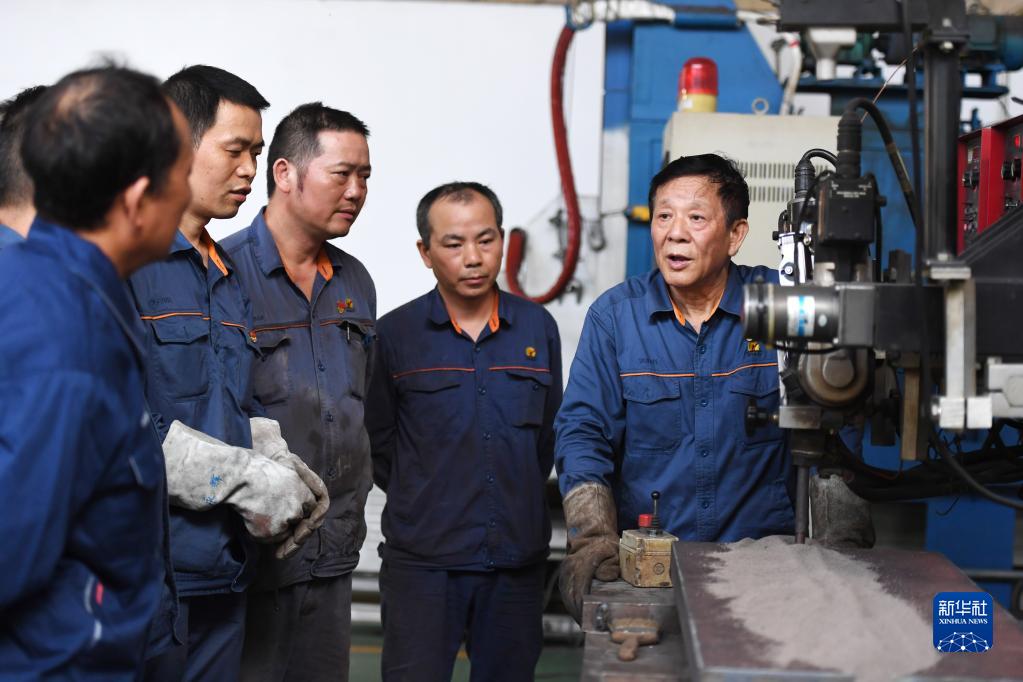 6月17日,艾愛國(左一)在湖南湘潭湘鋼高級技工學(xué)校焊接實習(xí)基地檢查學(xué)生的焊接作業(yè)。新華社記者 薛宇舸 攝