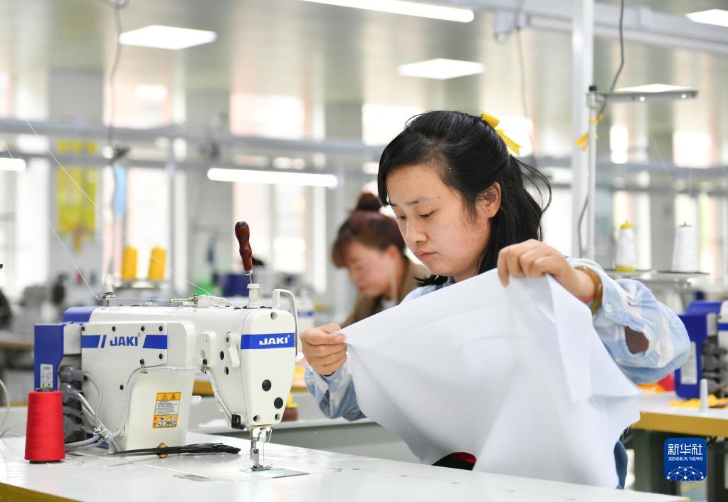 2021年4月20日,工人在位于陜西省銅川市耀州區(qū)照金鎮(zhèn)圣源小區(qū)的社區(qū)工廠內(nèi)加工服裝。新華社記者 張博文 攝