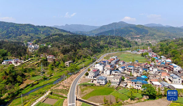 這是4月9日在新縣郭家河鄉(xiāng)拍攝的鄉(xiāng)村景色(無(wú)人機(jī)照片)。新華社發(fā)