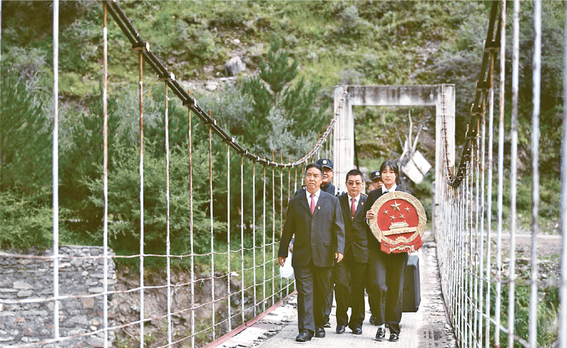 青海省果洛藏族自治州班瑪縣地處高原,山大溝深,群眾居住分散。近年來,班瑪縣人民法院深入各鄉(xiāng)鎮(zhèn),將巡回法庭搬到森林、草原,在牧民家門口提供訴訟服務(wù),還通過以案說法、模擬法庭等形式,開展法律咨詢、法治宣傳。圖為2021年8月7日,班瑪縣人民法院巡回法庭成員前往燈塔鄉(xiāng)班前村提供法律服務(wù)?!⌒氯A社記者 張龍/攝